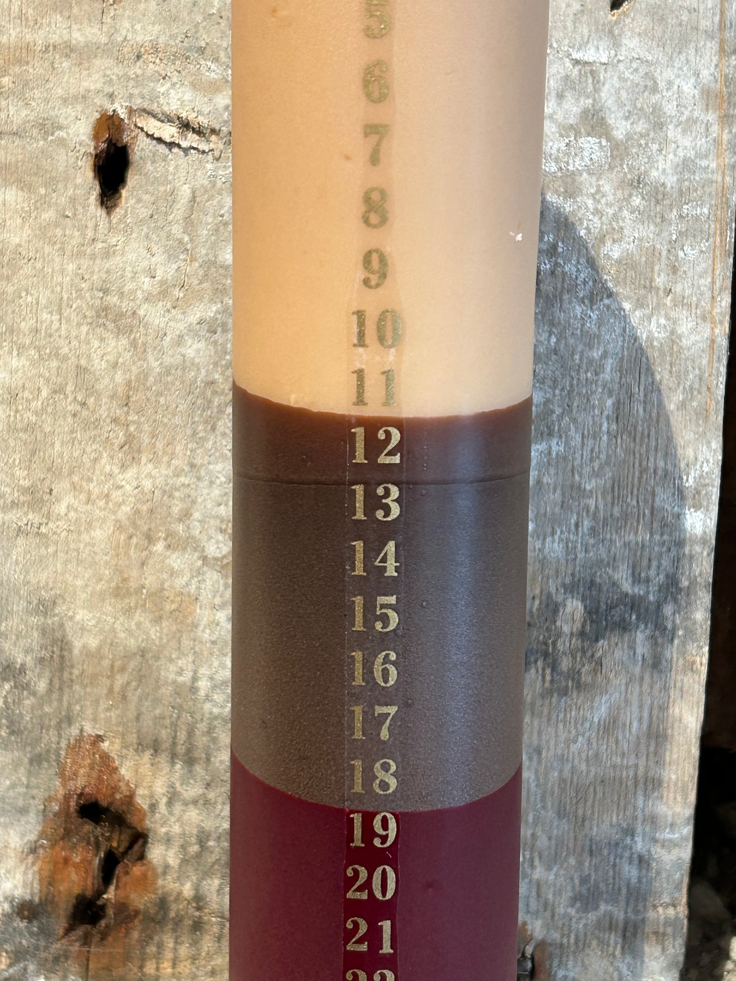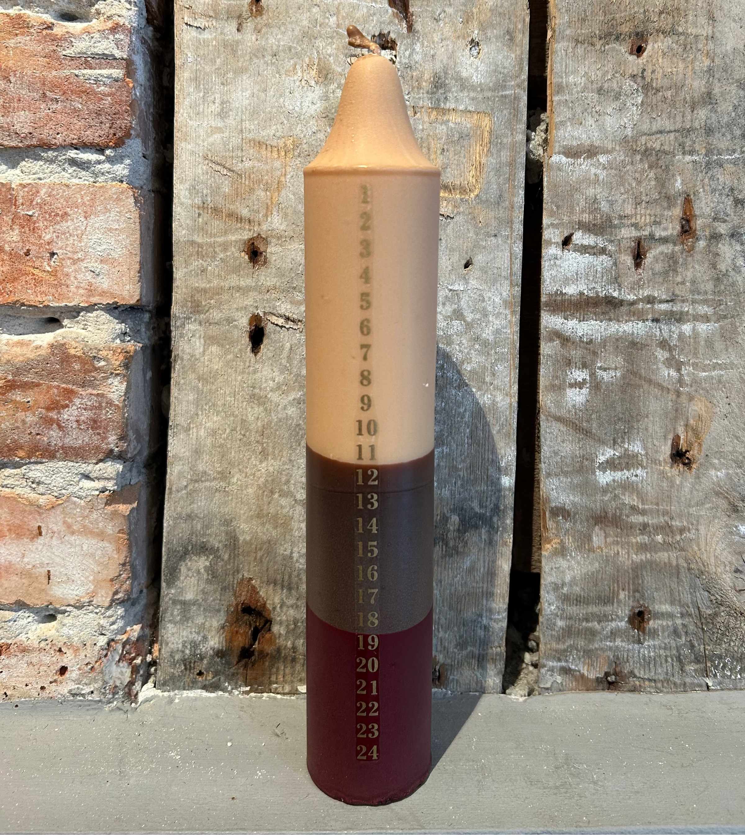 One of a Kind - smukt kalenderlys i flotte og klare farver. Nærmest en skulptur i sig selv. Kalenderlyset har en brændetid på ca. 50 timer, så du kan nyde det både morgen og aften i de mørke decemberdage. Brændetid mellem hvert tal er ca. 2 timer.