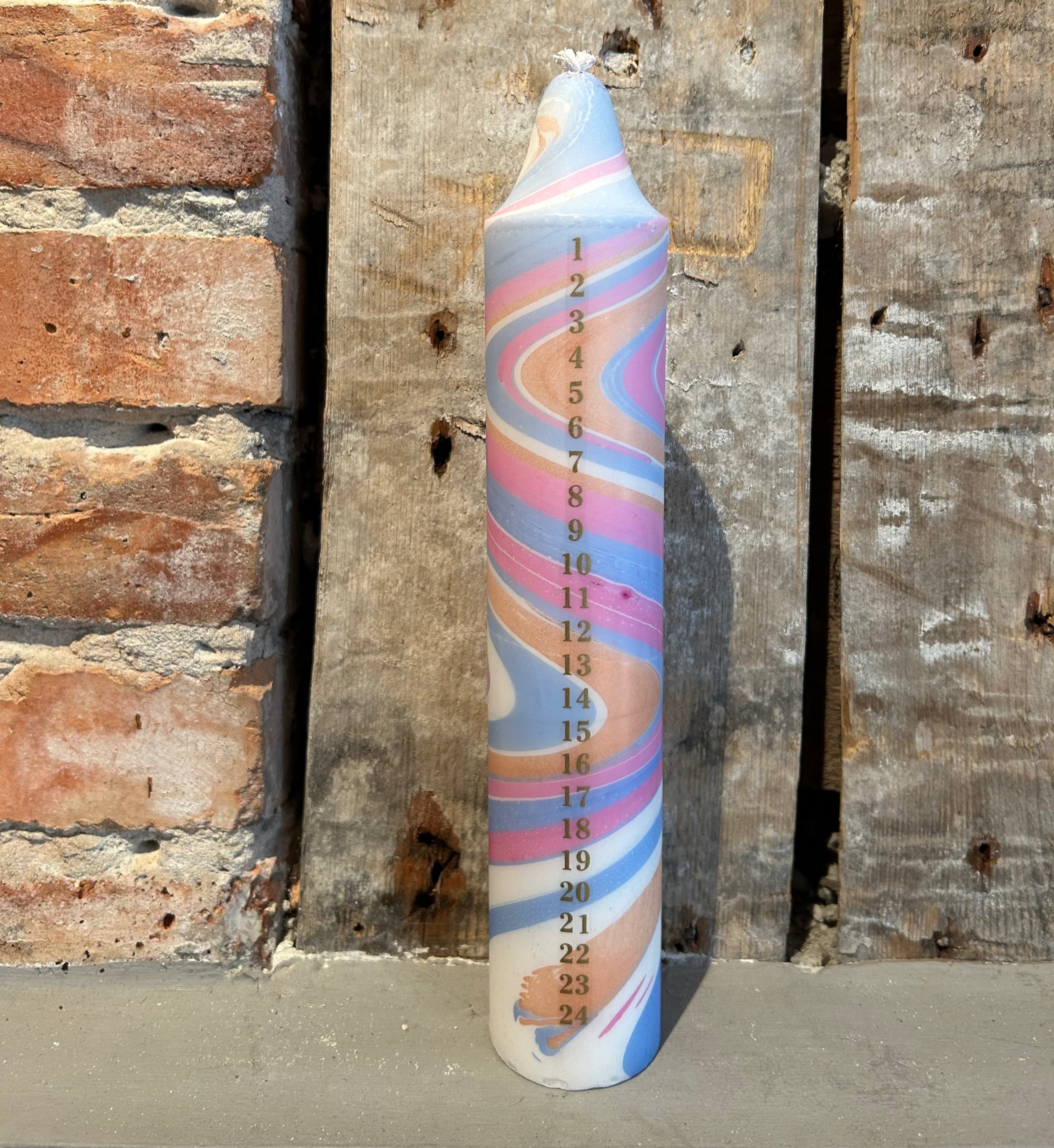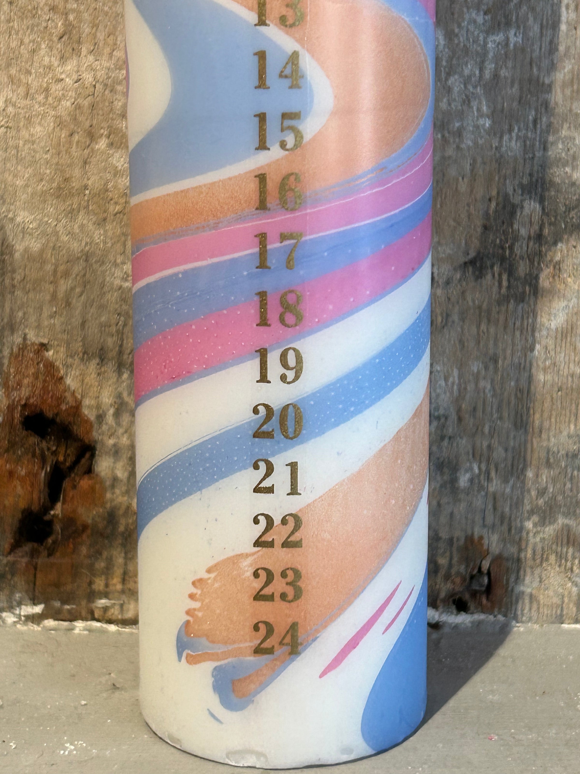 Kalenderlys med marmor-mønster · glitter / pink / blå