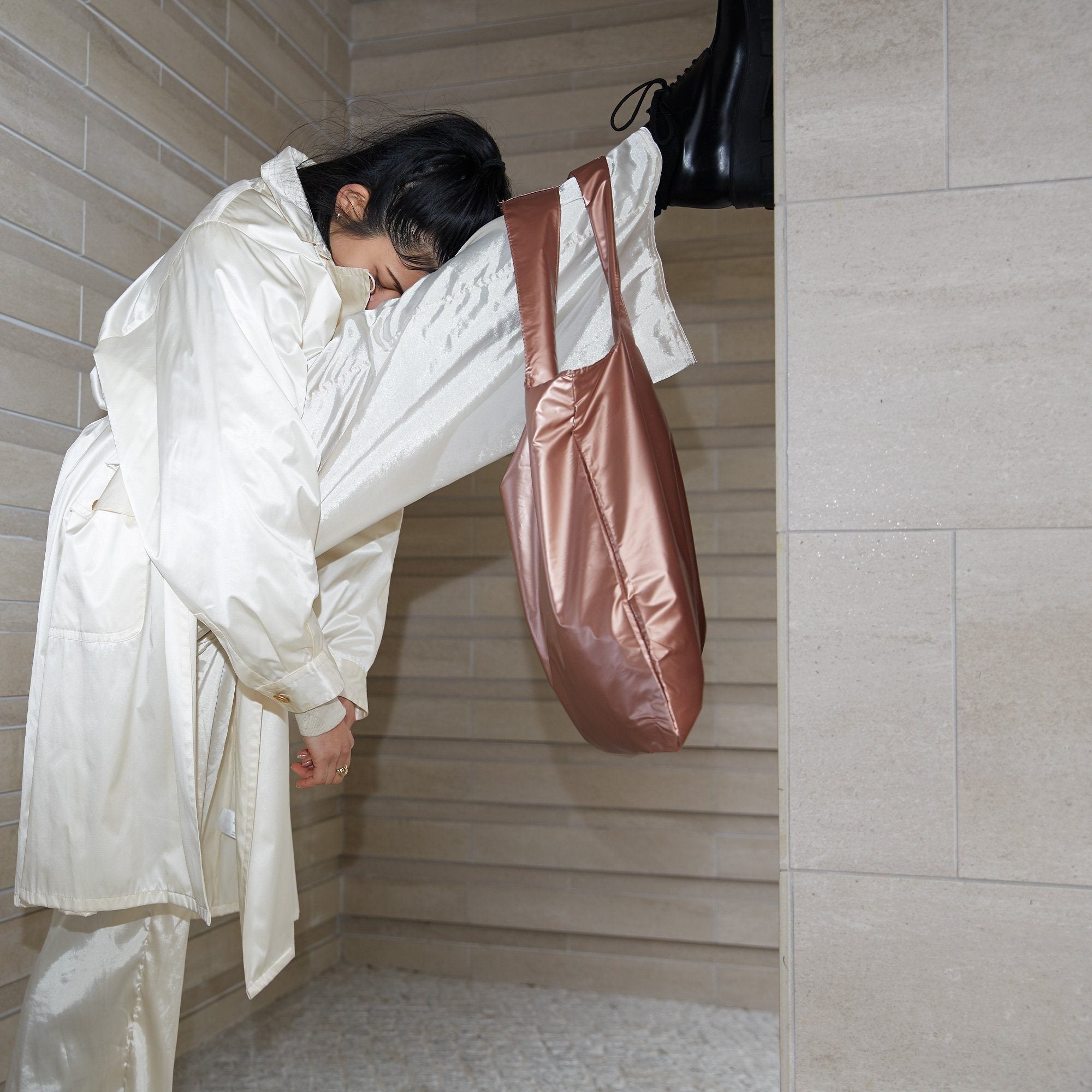 Lavet af genbrugsmateriale med en ekstra metallisk belægning.