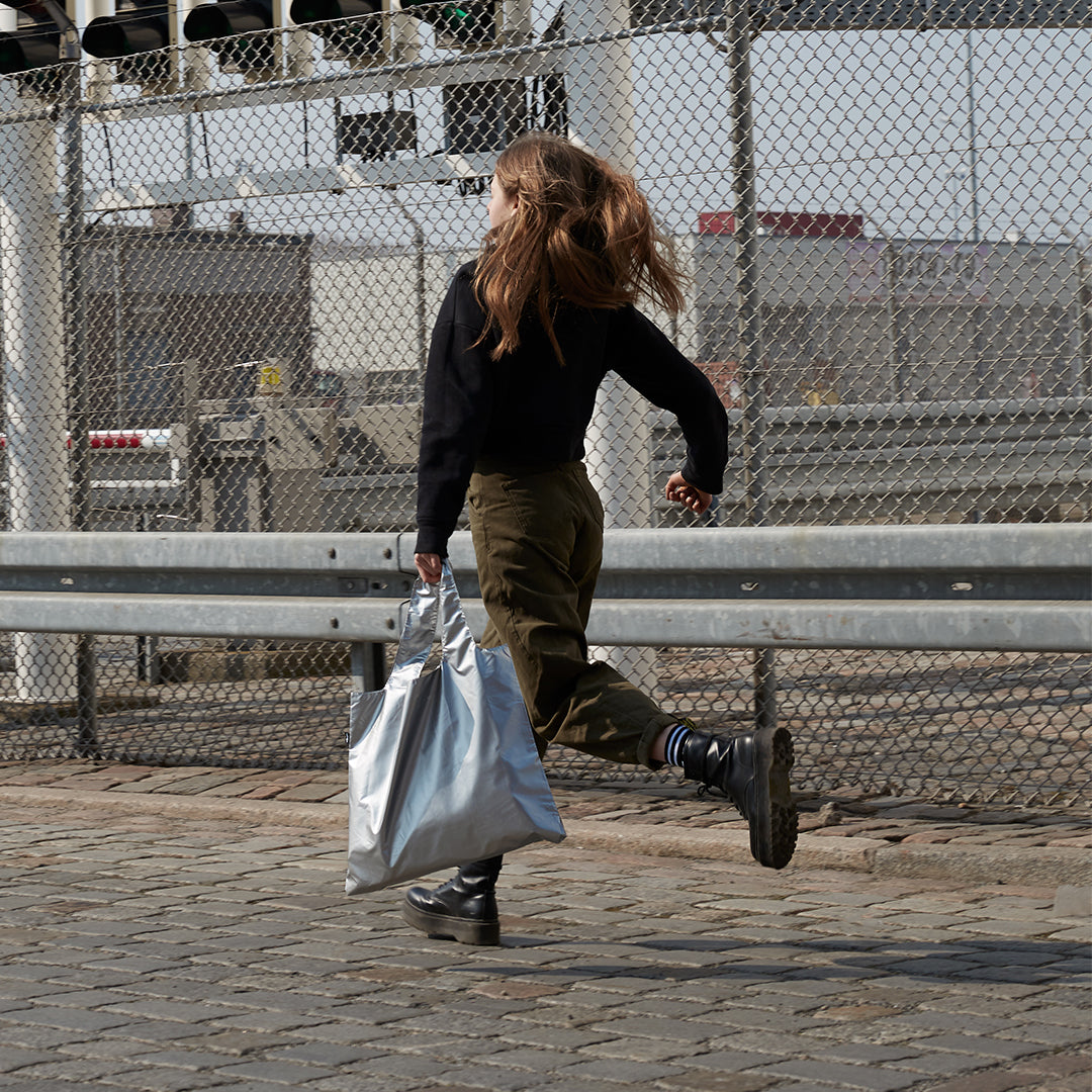 Lavet af genbrugsmateriale med en ekstra metallisk belægning.