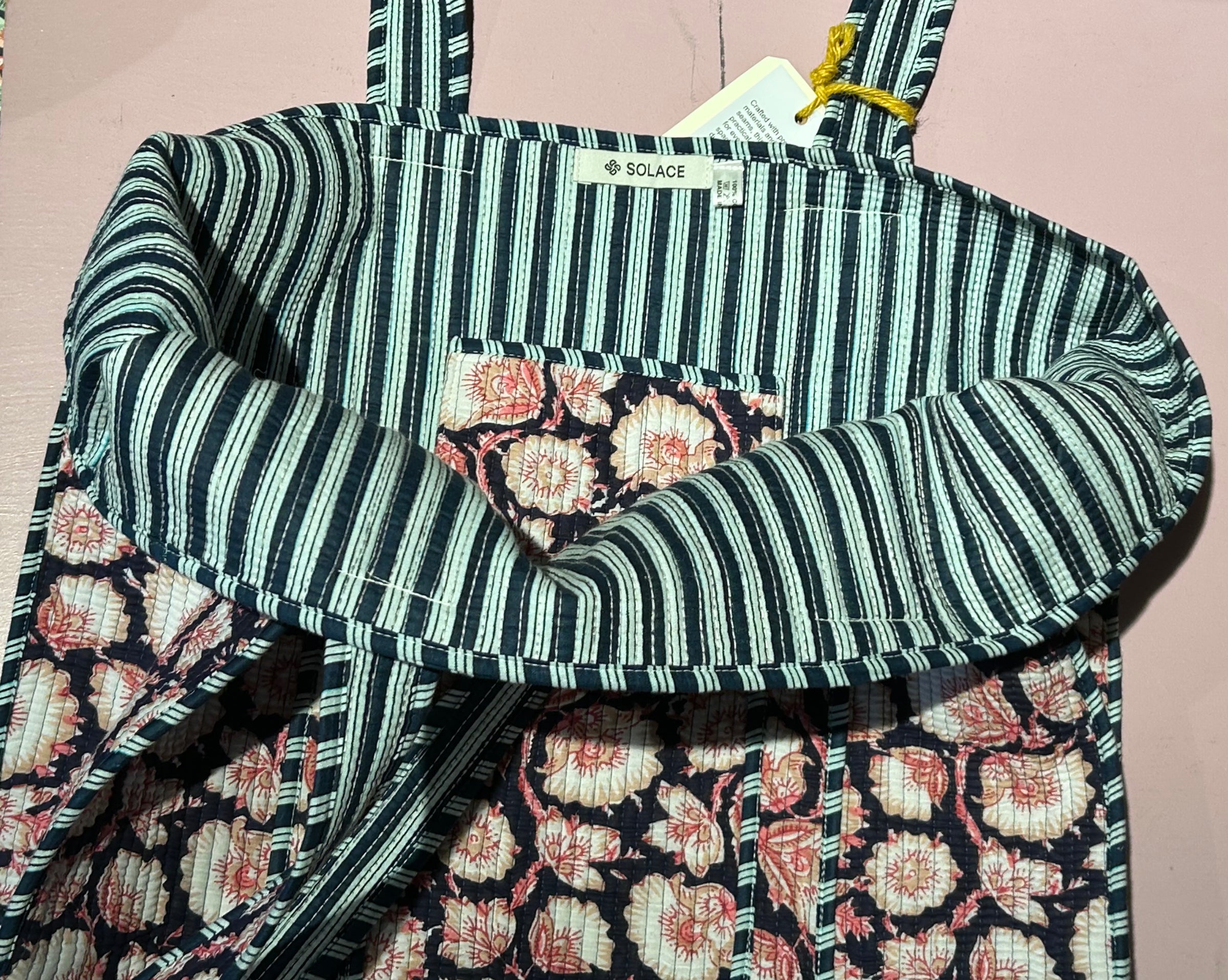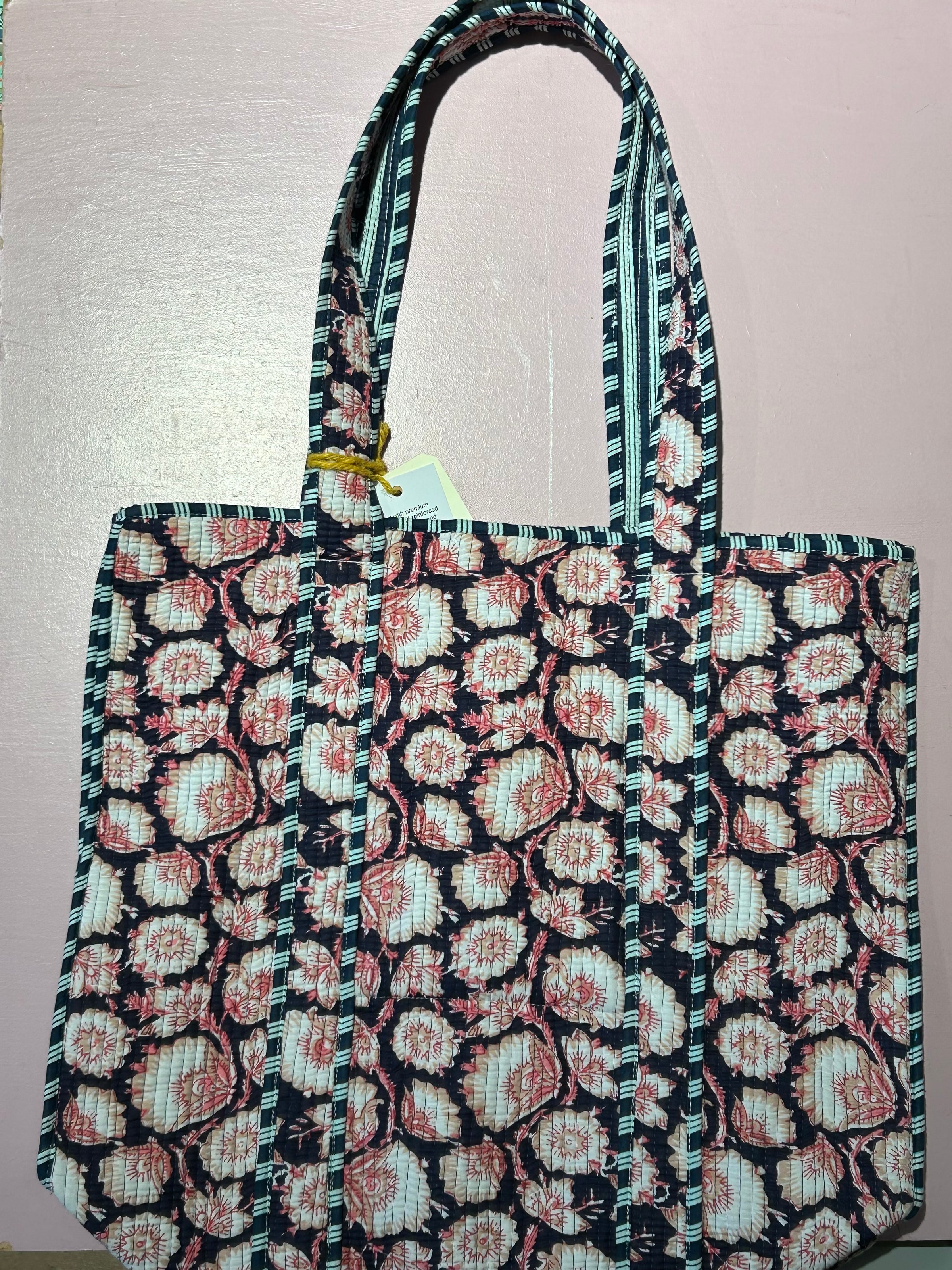 Smuk, quiltet taske til indkøb, strikkeprojekter eller strandturen - kun fantasien sætter grænser. Tasken er syet af rest-stof, så derfor findes kun få med samme mønster. Tasken kan vendes, så du har mulighed for at ændre udtrykket.