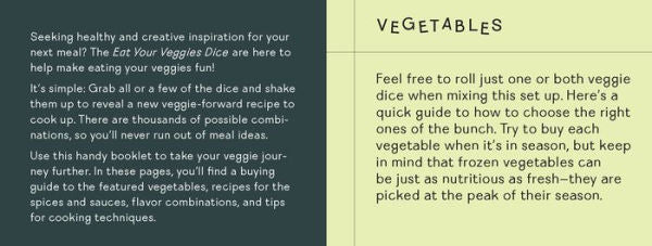 Terningespillet indeholder 6 terninger - og alle kan være med! Nybegynder-kokken, nybegynder-vegataren - spil terningen og find passer af inspiration og nem vejledning til en grønnere og sundere kost!